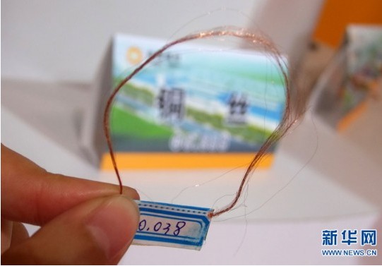 5月11日,記者在展會現場看到的山東某展商帶來的直徑為0.038mm的雙零線,這種銅絲廣泛用于手機震動器和軍工產品,其直徑比頭發絲還細。(來源:新華網)