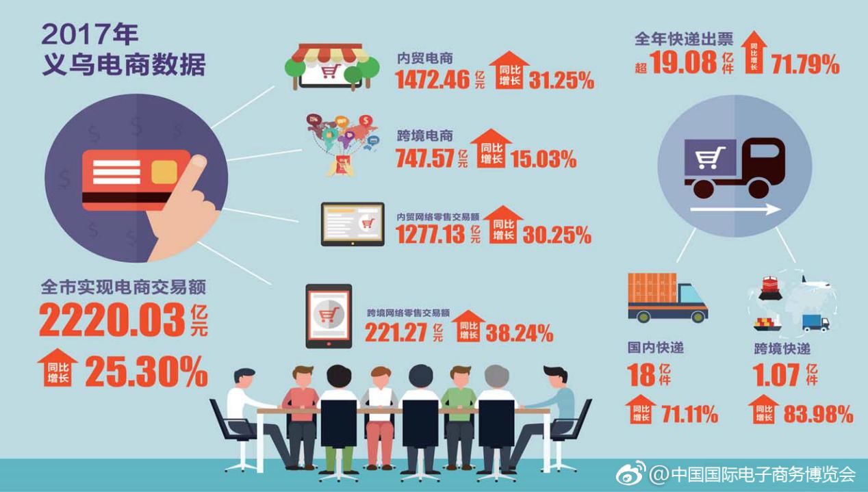 2017年,義烏市實現電商交易額2220.03億元,同比增長25.30%。其中,內貿電商1472.46億元,同比增長31.25%;跨境電商747.57億元,同比增長15.03%。內貿網絡零售交易額1277.13億元,同比增長30.25%;跨境網絡零售交易額221.27億元,同比增長38.24%。