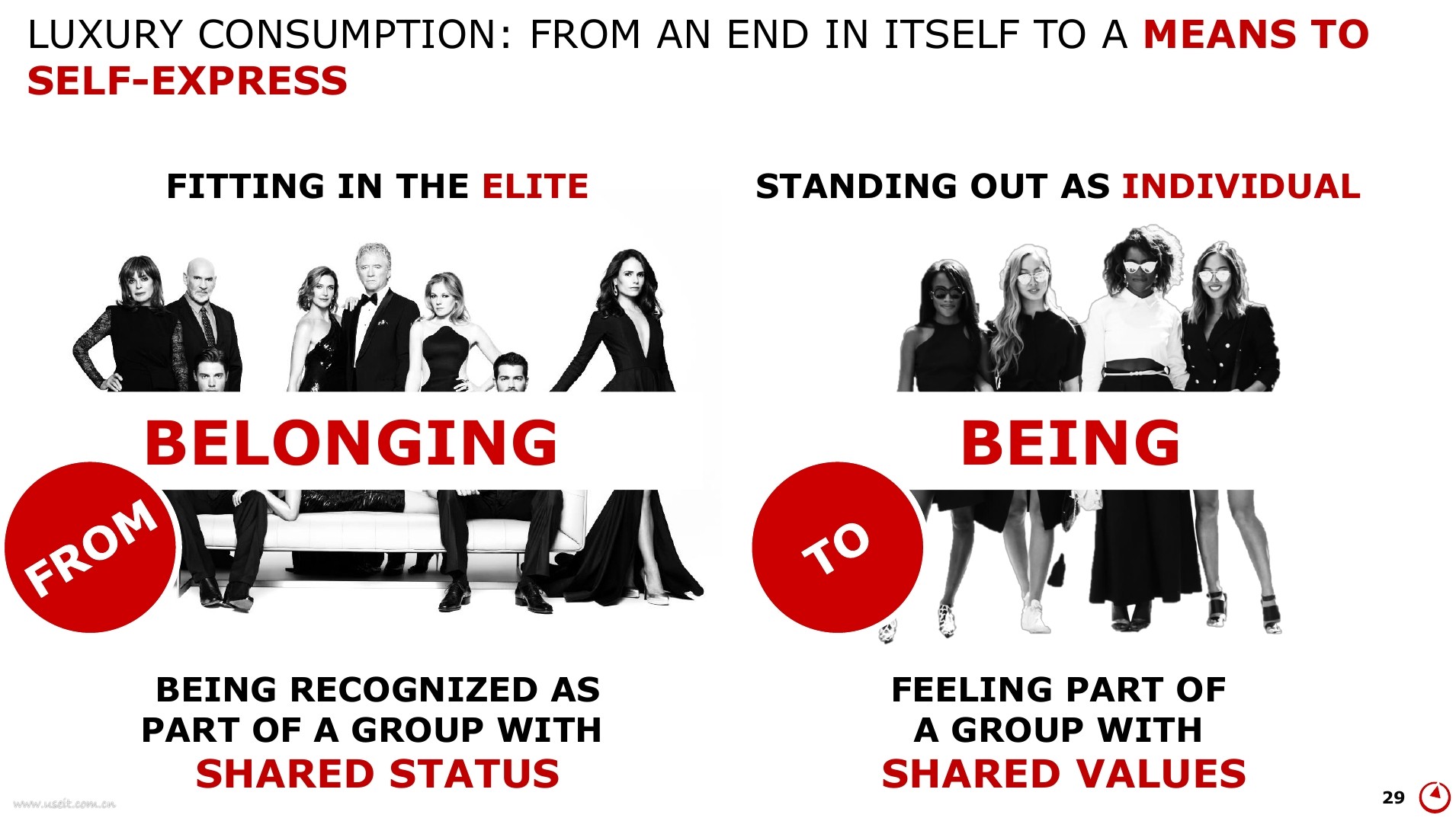 不同于上幾代購(gòu)買(mǎi)者的炫耀性消費(fèi),伴隨互聯(lián)網(wǎng)和數(shù)字化的發(fā)展,千禧一代天然對(duì)奢侈品的認(rèn)知度高,有自己對(duì)品牌的理解和對(duì)時(shí)尚的看法。“時(shí)尚”、“新潮”、“個(gè)性化”、“當(dāng)季“是對(duì)奢侈品應(yīng)被賦予全新定義。諸多奢侈品牌為適宜消費(fèi)人群的轉(zhuǎn)變,對(duì)自身品牌進(jìn)行重新定位。奢侈品市場(chǎng)逐漸也向多元化、多樣化、個(gè)性化的方向發(fā)展。