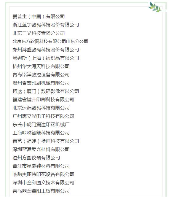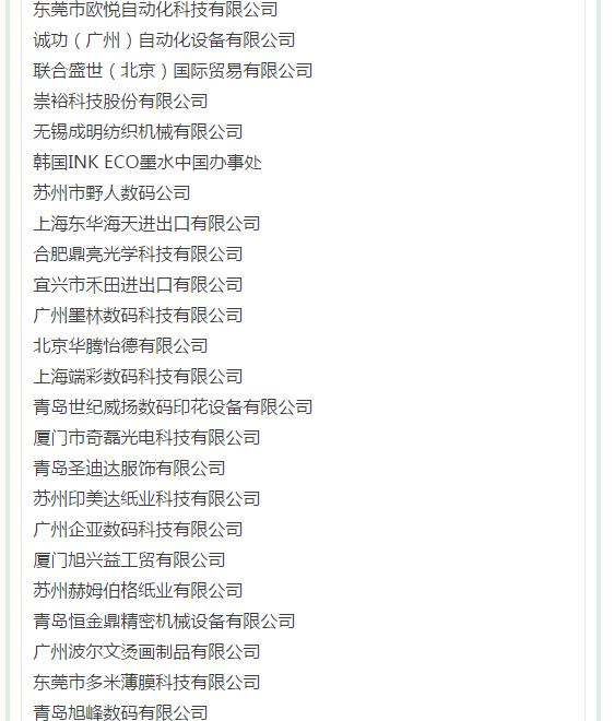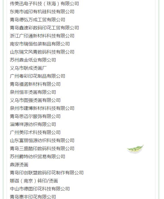 2.印花材料 噴墨墨水、熱升華墨水、熱固油墨、水性油墨、轉印油墨、噴墨印花前后處理助劑、制版材料、印花膠漿、印花助劑、印花涂料、金蔥粉、印染助劑、樹脂、色漿、糊料粘合劑、硅膠、熱熔膠、燙金紙、燙畫紙及轉印紙、植絨粘合劑、植絨助劑等。