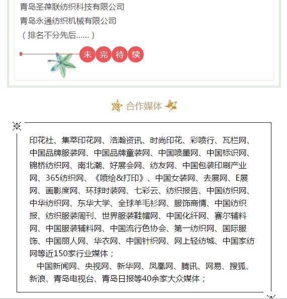 青島印花展現已報名上百家企業,我們已邀約專業觀眾5000+家的企業(印花廠、印染廠、貿易公司、設計師、家用紡織品制造廠等),還有100+家新聞媒體進行跟進報道。我們會給您進行最好的宣傳,和您一起占據市場!