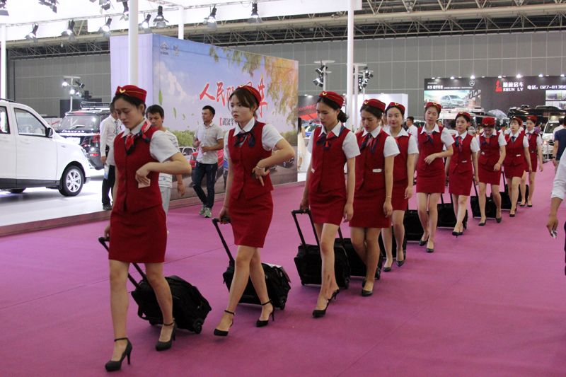 裝扮成空姐的小姐姐們提著手提箱,是國博一條靚麗的風景線