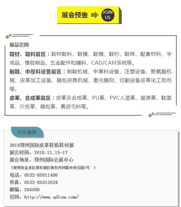 2018鄭州國際皮革、鞋機、鞋材展暨國際針織機械、飛織鞋面展(2018鄭州鞋機鞋材暨針織機械展)將于2018年11月15-17日在鄭州國際會展中心(鄭東新區)舉行,展會觀眾在線預登記通道現已全面開通!有意向參觀展會的鞋革、箱包、服裝等產業鏈上下游人士,只需完成在線預登記,即可獲得提前郵寄資料、免費領取價值百元會刊、現場優先參與行業活動等福利!