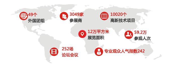 上一屆高交會總面積達12萬平方米,共有全國38個省、自治區、直轄市、計劃單列市(含香港、澳門、臺灣、新疆生產建設兵團)組團、27所知名高校、來自46個國家及歐盟在內的49個外國團組參加了本屆高交會,其中27個“一帶一路”沿線國家參展。共有來自102個國家和地區的59.2萬人次觀眾,論壇會議總場次超過252場。平均每天每個展位共接待242位專業觀眾、平均每天每個展位共接待63位有意向或有實際采購行為的采購商。共有250家海內外媒體、1500名記者參與了深入報道