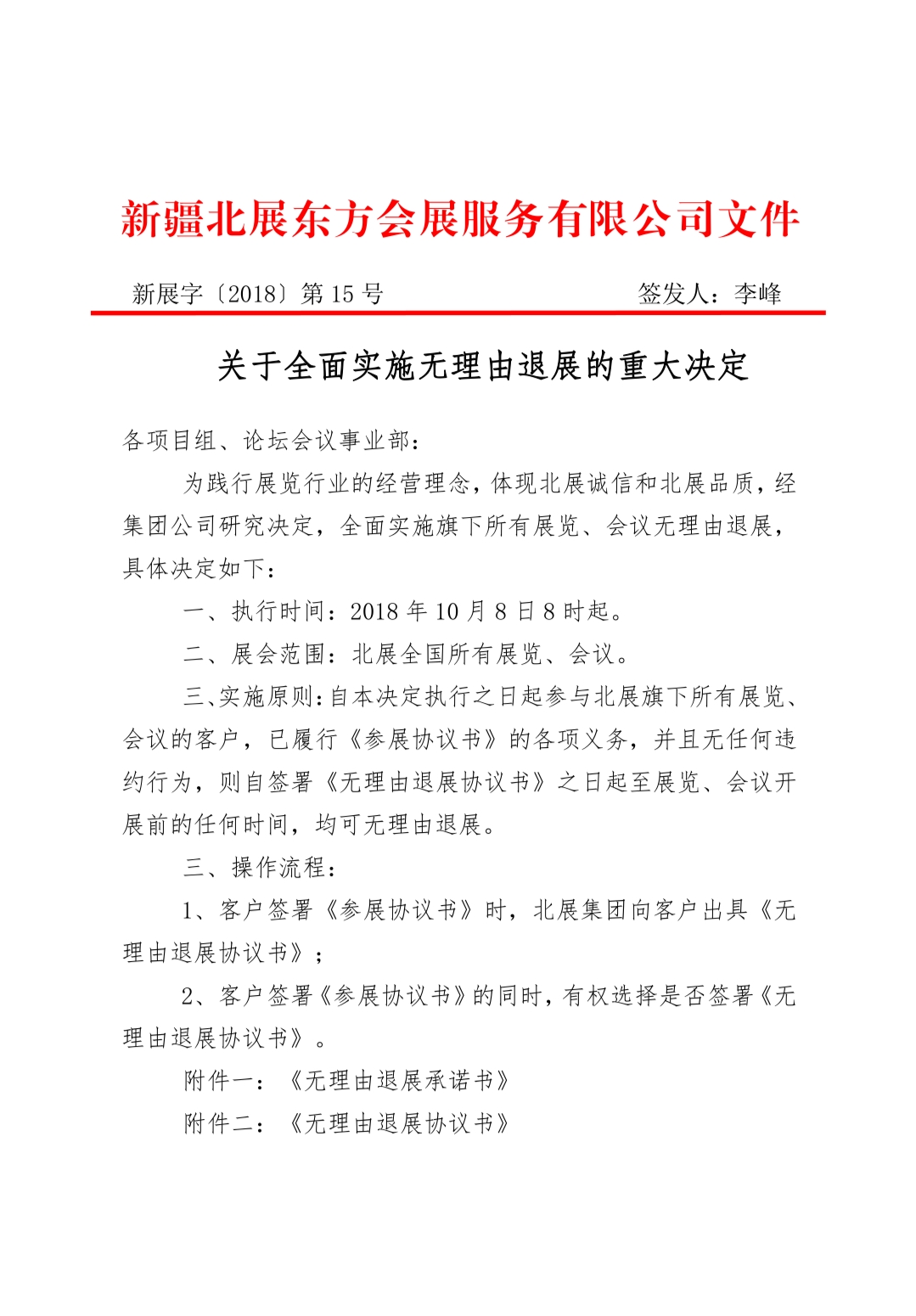 新疆北展東方會展服務有限公司為什么做出這樣的決定?不僅僅是對自身組展能力的強大自信,更是想為整個會展行業的良性發展貢獻力量。近幾年來,我國會展業進入了快速發展的黃金期,在這同時也存在著許多問題,其中之一就是“騙展”。國內很多城市會展業都出現“騙展”、“拼盤展”、“重復展”等問題,甚至形成了一批有資金、有經驗的騙展團伙,嚴重影響了這個前景很好的服務業的健康發展。在不斷曝出的騙展事件背后,企業面臨著在選擇展會時難以決斷的窘境。新疆北展東方會展服務有限公司作為專業組展公司,將肩負行業使命,為會展業的繁榮發展做出貢獻。北展東方會展服務有限公司總經理李峰說,無理由退展,是我們向每一位參展商的承諾,同時也體現了北展做行業展會領導者的決心。