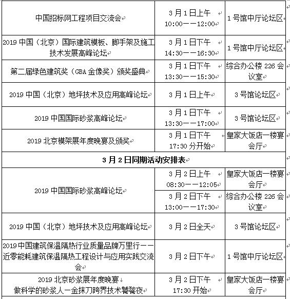 ConstrucTech 2019建筑四新展召開期間還將舉辦多場行業活動,包括:2019中國模板腳手架產業發展峰會、中國砂漿周系列峰會、2019中國地坪技術與應用論壇、2019中國建筑保溫隔熱行業質量品牌萬里行——近零能耗建筑保溫隔熱工程設計與應用實踐交流會、現場施工演示會、工程項目交流會、第二屆綠色建筑獎(GBA金像獎)頒獎盛典、2019北京模架展年度晚宴、2019北京砂漿展年度晚宴、ConstrucTech建筑師設計師對話等近10余場活動。同期活動安排如下: