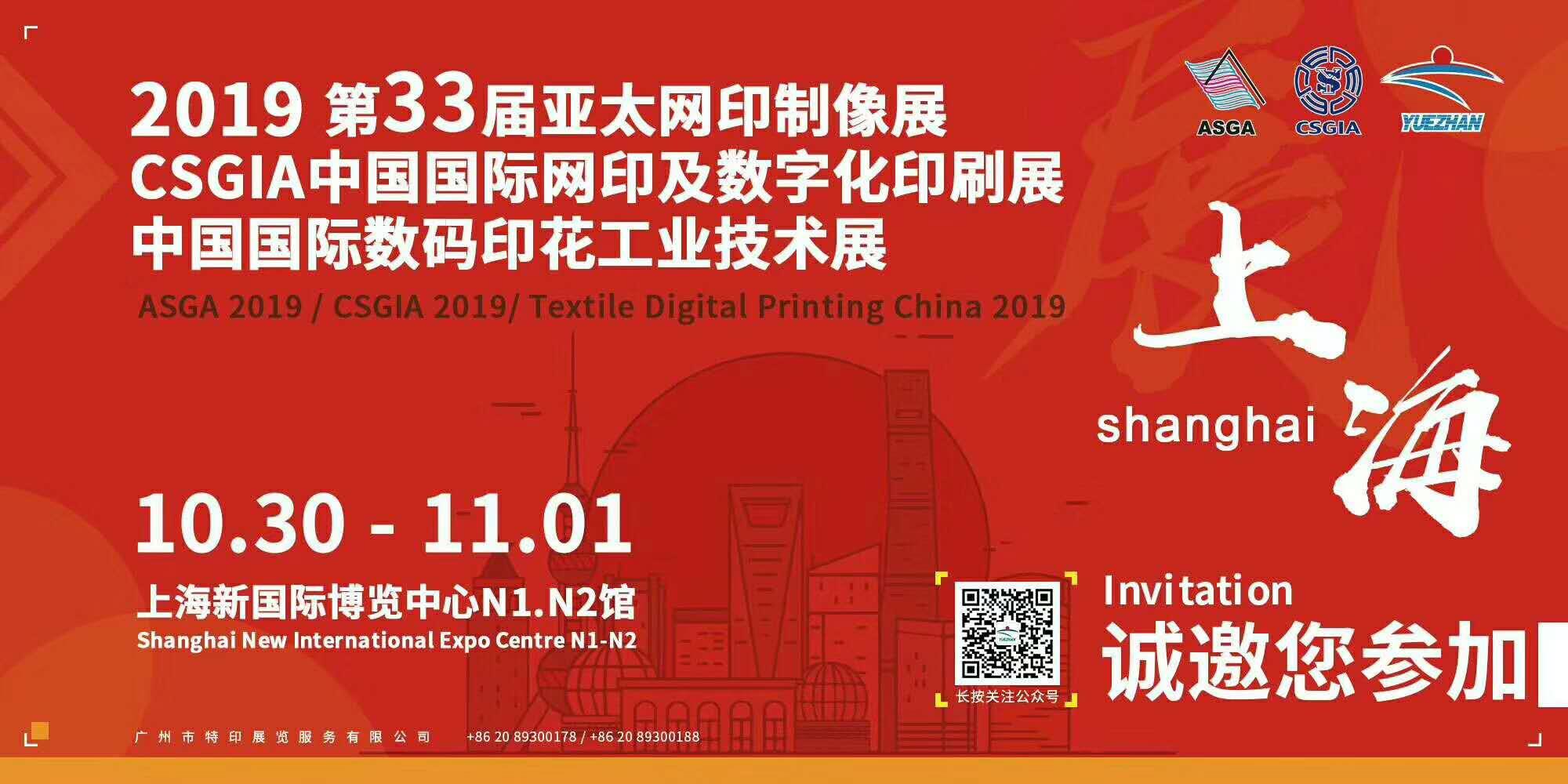 2019年亞太網(wǎng)印制像展、CSGIA 中國國際網(wǎng)印及數(shù)字化印刷展兩大品牌聯(lián)手將于2019年10月30日-11月1日在上海浦東新國際博覽中心給大家呈現(xiàn)絲網(wǎng)印刷、紡織品印花、數(shù)碼印花與廣告標(biāo)識(shí)完美融合的主題盛會(huì)。屆時(shí),我們將推出第10屆亞太精品評(píng)比和第19屆金網(wǎng)獎(jiǎng)精品評(píng)比,真誠歡迎行業(yè)內(nèi)網(wǎng)印數(shù)碼印刷企業(yè)的積極參與。