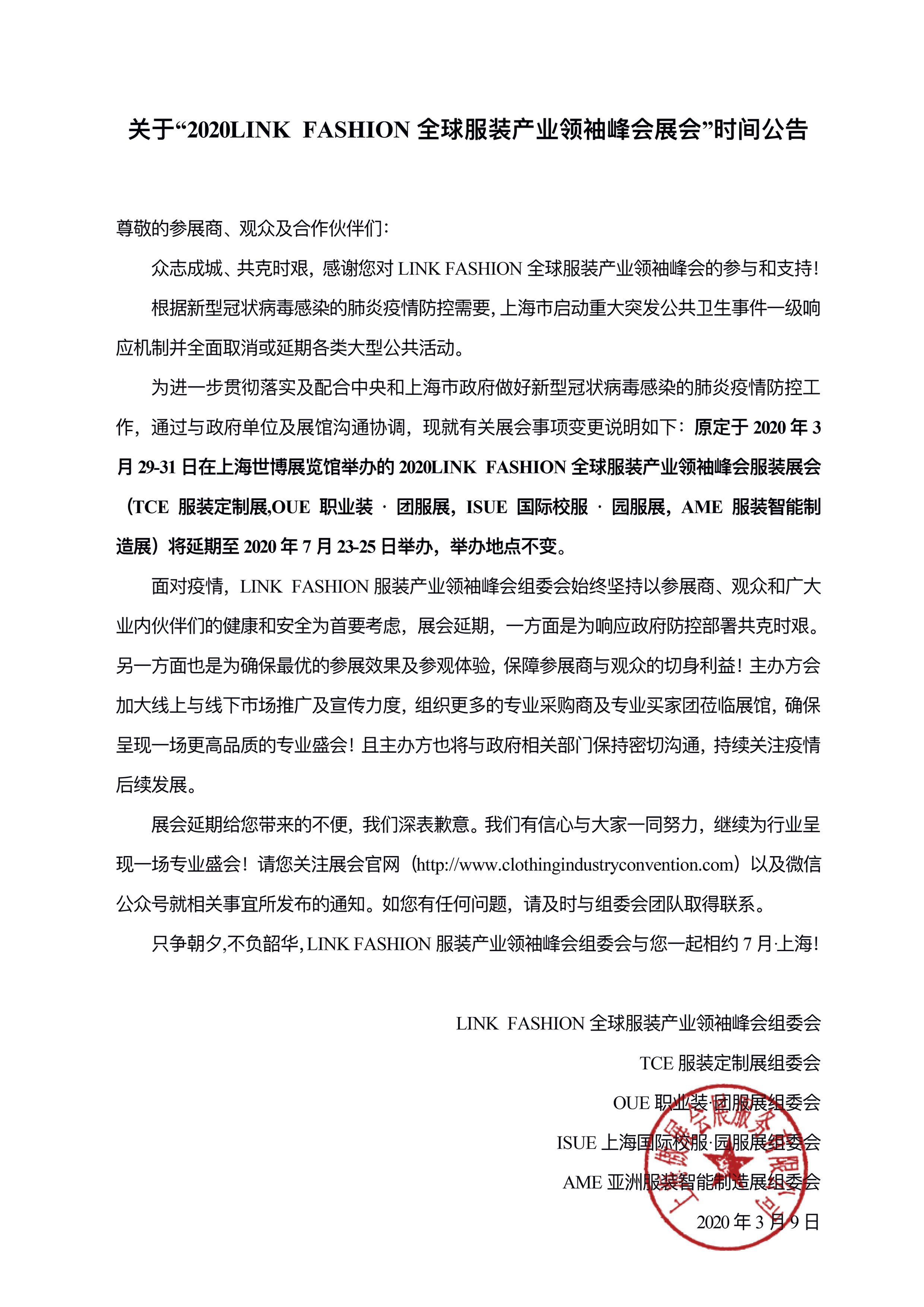為進一步貫徹落實及配合中央和上海市政府做好新型冠狀病毒感染的肺炎疫情防控工作,通過與政府單位及展館溝通協調,現就有關展會事項變更說明如下:原定于2020年3月29-31日在上海世博展覽館舉辦的2020LINK FASHION全球服裝產業領袖峰會服裝展會(TCE服裝定制展、OUE職業裝·團服展、ISUE國際校服·園服展、AME服裝智能制造展)延期調整如下: