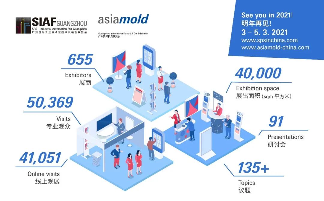 SIAF廣州國際工業自動化技術及裝備展覽會及同期Asiamold廣州國際模具展覽會,在廣州中國進出口商品交易會展館舉辦,總面積達 4萬平方米。兩場展會共迎來655家參展商,參觀入場總數達50,369,線上直播觀展總數達41,051人次。涵蓋多種智能工業自動化解決方案、模具制造、3D打印、金屬加工、鑄造、壓鑄、激光及軸承技術,為制造業提供一站式采購平臺,助力全球眾多企業與生產線恢復業務。