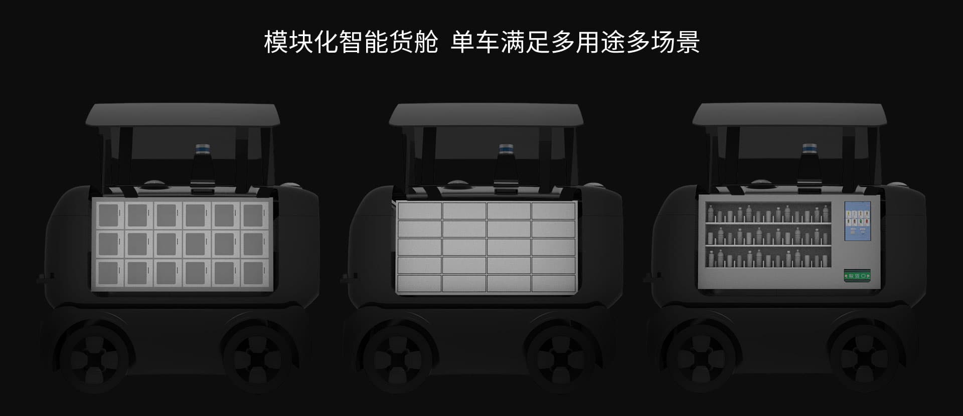 迅哥首款商用低速無人車搭配不同箱體,可以有不同用途,包括無人物流、無人配送、無人售賣、無人消殺、無人安防等。