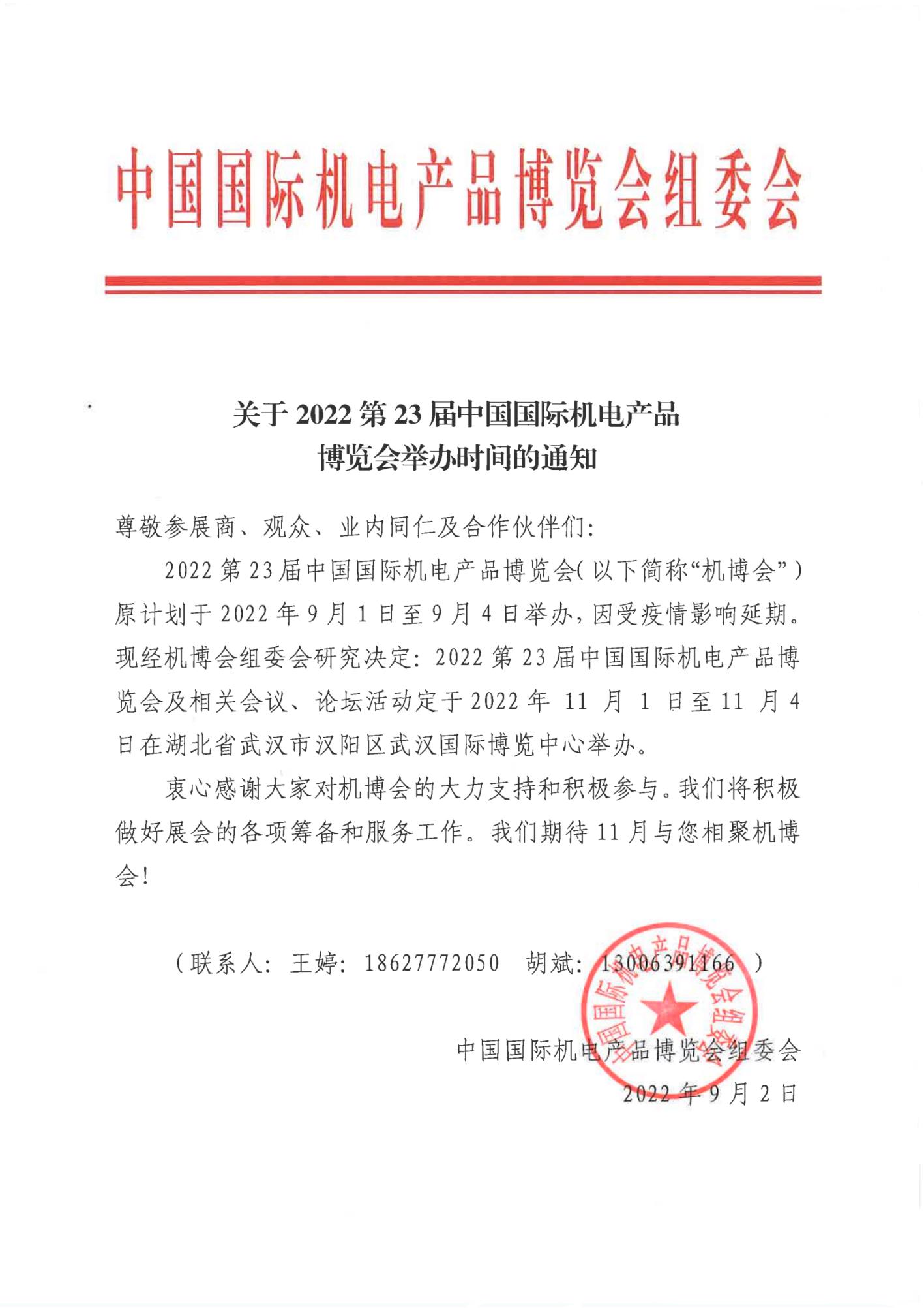 2022第23屆中國國際機(jī)電產(chǎn)品博覽會(huì)(以下簡稱“機(jī)博會(huì)”)暨第11屆武漢國際機(jī)床展,原計(jì)劃于2022年9月1日至9月4日舉辦,因受疫情影響延期。現(xiàn)經(jīng)機(jī)博會(huì)組委會(huì)研究決定:2022第23屆中國國際機(jī)電產(chǎn)品博覽會(huì)暨第11屆武漢國際機(jī)床展及相關(guān)會(huì)議、論壇活動(dòng)定于2022年11月1日至11月4日在湖北省武漢市漢陽區(qū)武漢國際博覽中心舉辦。