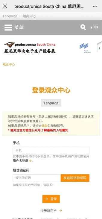 進入預登記頁面后,往屆觀眾可直接填寫手機號,獲取驗證碼登錄,新用戶請點擊[注冊新用戶]按鈕注冊。