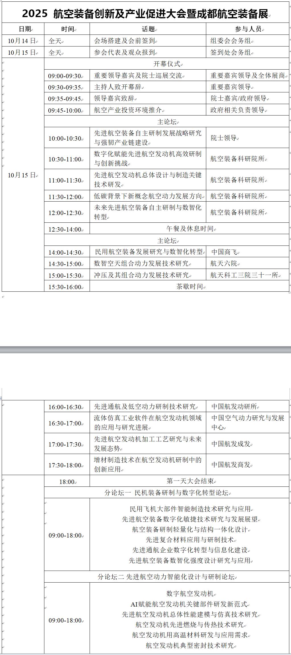 (一)本次大會特邀請國內領先航空裝備整機科研院所、高校等單位出席做演講報告,地方政府做航空產業推介。大會將設置一個主論壇+五個分論壇,重點圍繞先進航空裝 備研制與數字化轉型、未來航空發動機智能化設計與先進制 造加工技術、AI賦能航空裝備智能化運維保障與中小型航空 動力等領域展開交流與討論